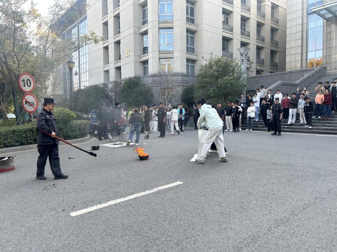 11月13日下午,针对部分学生存在的消防应急“风险辨识弱、实操经验缺”的问题开展了消防实操培训。上午培训中,同学们已了解了不同灭火器的使用场景。实操环节,保卫处老师将灭火器使用要领凝练为“提、拔、握、压”四步,并细致说明灭火毯使用规范,从展开到覆盖火源的角度、力度,都耐心指导。理论讲解结束,实战演练开启。面对废液引燃模拟场景,同学们两两配合,熟练展开灭火毯,精准覆盖火源,隔绝氧气控制火势。随后进行灭火器实操,同学们迅速打开保险销,稳稳举起灭火器,将喷口对准火源根部,果断按下压把,白色灭火剂喷射而出,成功灭火。整个过程紧张有序,同学们动作规范、反应迅速,尽显培训成效。