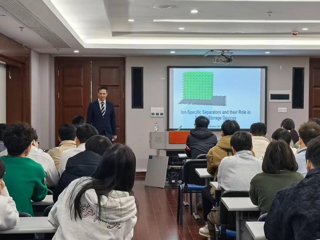在报告中,Hill教授系统阐述了多孔材料在清洁能源生产与储存中的关键作用,重点介绍了该类材料在气体分离、碳捕获与能源转换领域的最新进展。他结合自身丰富的研究经验与国际前沿动态,深入剖析了多孔材料在能源体系中的结构调控机制与性能优化路径,为与会师生带来了一场内容丰富、启发深刻的学术盛宴。