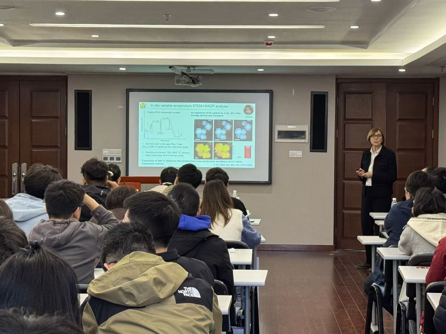 报告结束后,现场师生踊跃提问,与两位专家就报告中的学术难点和研究方法展开了广泛而又深入的交流。Svetlana Mintova教授与郭海玲教授详细回答了师生们的疑问。最后,张玉亭副教授代表重点实验室再次向两位专家的精彩分享表示感谢。本次学术报告为师生搭建了高水平的学术交流平台,拓宽了相关研究领域的学术视野,取得圆满成功。